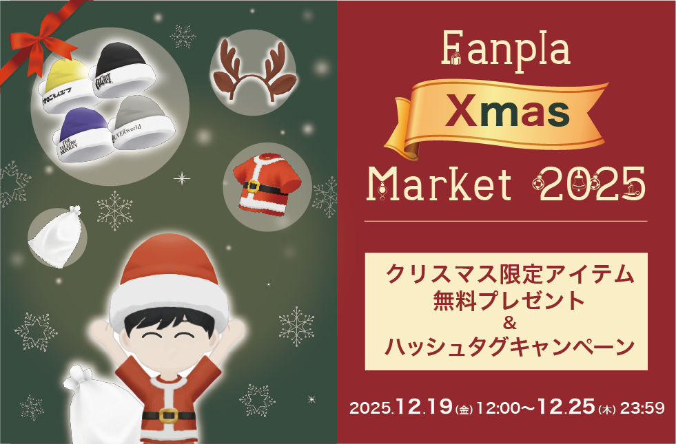 期間中、メタバースアプリ「FANPLANET」内のARTIST WORLDにおいて、対象アイテムを身に着けたアバターで記念撮影を行い、Xにハッシュタグ「#ファンプラクリスマス」を付けて投稿を引用リポストいただいた方の中から抽選で、Fanpla Marketで使用できる暗号資産Fanpla(FPL)をプレゼントいたします。
